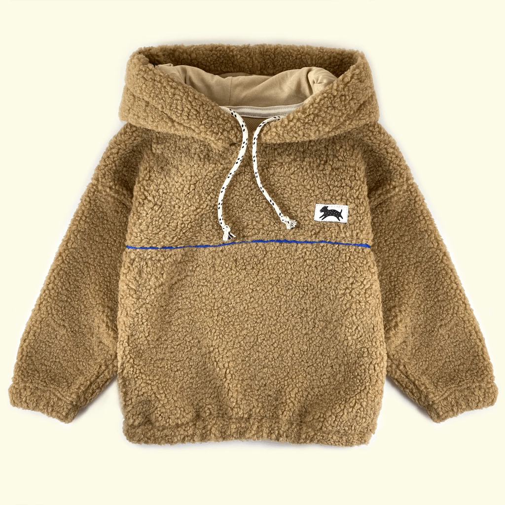 Tené en cuenta que la moldería de este Buzo es más pequeña. Te recomendamos elegir un talle más del habitual (Ejemplo: si siempre compras T6, te recomendamos que lleves T8 de este Buzo). Buzo UNISEX de corderito con capucha, calce relajado y hombro caído. Delantero con recorte y vivo a contratono. Cintura y puños con elástico interno y bolsillos en los laterales. Capucha forrada en jersey, con cordón trenzado para ajustar. Etiqueta del perrito en el delantero.